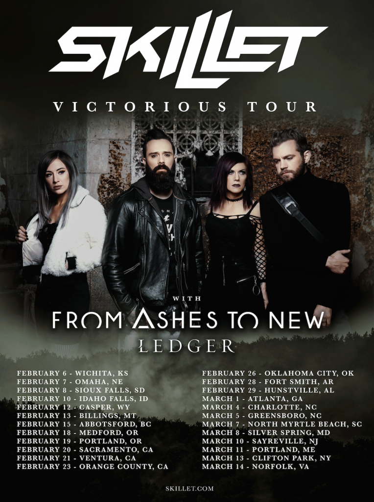 Skillet will return to the road in North America this winter in support of its tenth album, “Victorious”, out now. The band’s headline trek will kick off on February 6 in Wichita, Kansas and run through March 14 in Norfolk, Virginia. Support on the tour will come from From Ashes To New and Ledger, the latter of which features Skillet drummer Jen Ledger. Skillet is fresh off back-to-back fall 2019 co-headline North American tours with Sevendust and Alter Bridge, respectively. The band just wrapped a sold-out headline tour of Europe as well.