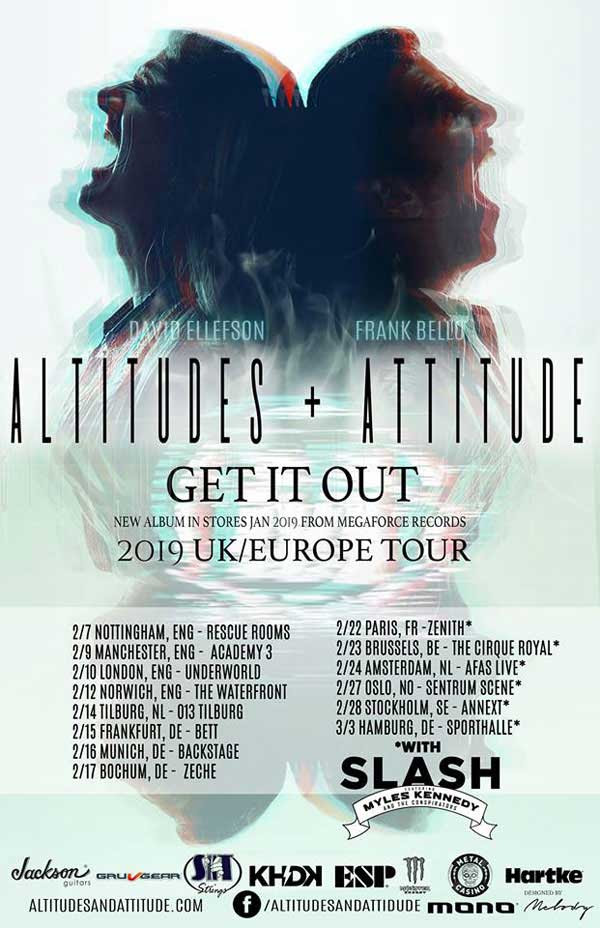 Altitudes & Attitude featuring Anthrax bassist Frank Bello and Megadeth bassist David Ellefson, have announced 2019 UK/European tour dates including 6 shows with Slash f/Myles Kennedy and the Conspirators in support of their debut album, “Get It Out”, due on January 18, 2019 via Megaforce Records.