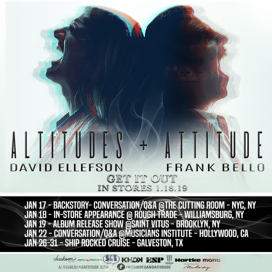 Altitudes & Attitude, the collaboration between Anthrax bassist Frank Bello and Megadeth bassist David Ellefson— two virtuosic bass players who’ve anchored some of the fiercest thrash records of all time — has confirmed a handful of appearances ahead of the release of its debut album, “Get it Out”, including an inaugural U.S. show on Saturday, January 19 at Saint Vitus in Brooklyn. Additional New York City appearances include an up-close question-and-answer session and performance on January 17 as part of the Guitar World “Backstory” series at the Cutting Room, an in-store signing January 18 at Rough Trade. Los Angeles events include a question-and-answer session on January 22 with Loudwire at the Musicians Institute, and appearances at NAMM on January 25, before the band heads to Europe in February.