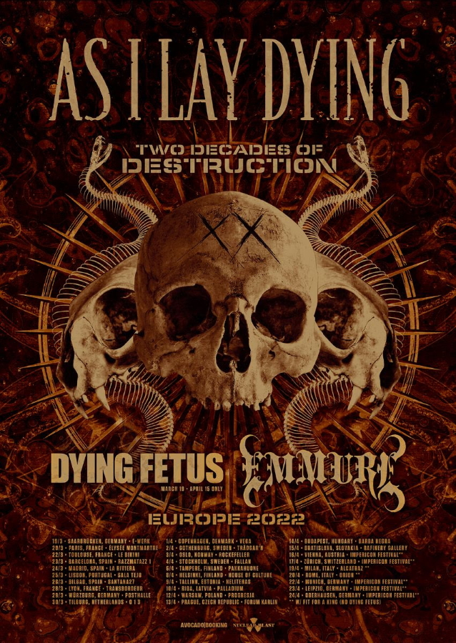 San Diego metallers As I lay Dying have announced the “Two Decades Of Destruction” European 2022 tour. The 29-date trek will kick off in Saarbrücken, Germany on March 19 and make stops in France, Sweden, and Italy before returning to Germany for the Impericon festivals. Joining the band on the tour will be Dying Fetus and Emmure, with select dates including Fit For A King.
