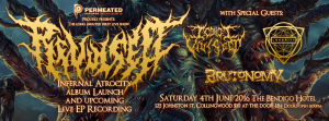 “Live Atrocity – The Inception Of Sufferance” – is the first Live CD/DVD double disc release of Melbourne’s death metal band Revulsed. The new band of extreme drummer Jayson Sherlock. “Live Atrocity” was filmed at their debut show 4th June 2016. All songs are taken from their debut album “Infernal Atrocity” the difference is, this CD is live version, with their new vocalist Damien Miriklis.