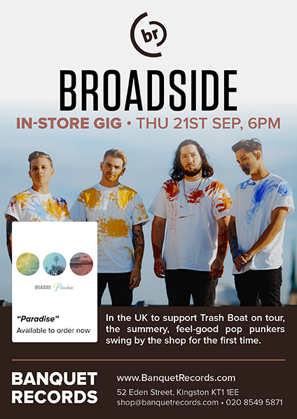 Broadside recently announced their first In-store Gig on Thursday 21st September at Banquet Records, Kingston, Surrey, KT1 1EE. (UK).