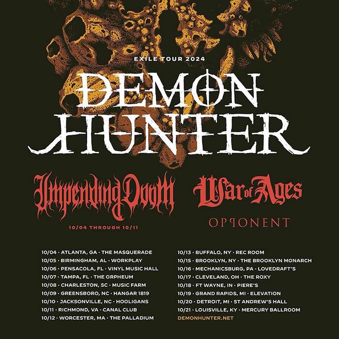 Seattle, WA metallers, Demon Hunter, have announced a U.S. run supporting their 2022 release, Exile. Support for the tour will be handled by Impending Doom (for the first leg), War Of Ages, and Opponent.