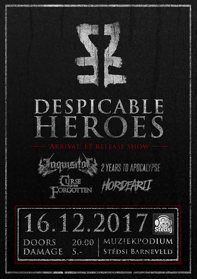 Despicable Heroes started in 2010 in a small town called “Barneveld”. Kevin (screamer/guitarist) and Gino (bass) were troubled during the proces of creative songwriting because of the absence of a drummer, Sam was found few weeks later making all aspects of a band complete. During the first year ‘DH’ has won the play-off on a local band competition, qualifying themselves by winning the semi-finals, at the finals of the provincial bandcontest in “Willemeen, Arnhem” during the “GESEL XL weekend”