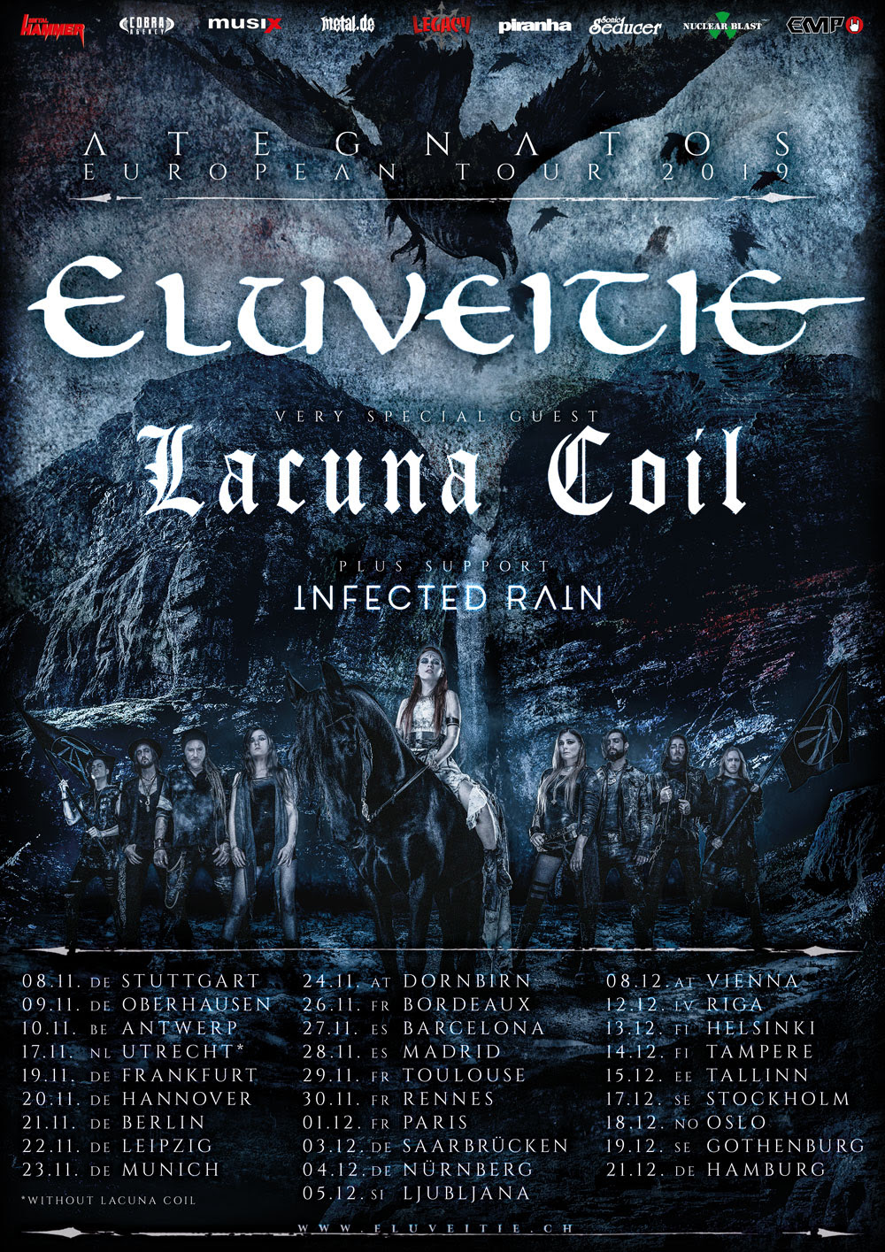 Eluveitie comments: “Our last few months have been extremely intense, creating ‘Ategnatos’. Now we simply cannot wait to bring our new songs to the stages and to share our passion, pure fucking metal and heartfelt Celtic mysticism with you all! And all the more we’re excited to bring such great bands with us! We feel honored to team up with our fellows of the heavyweight institution called Lacuna Coil and also with the amazing wizkid that is Infected Rain, whom we’ve shared festival stages with a few times already!”