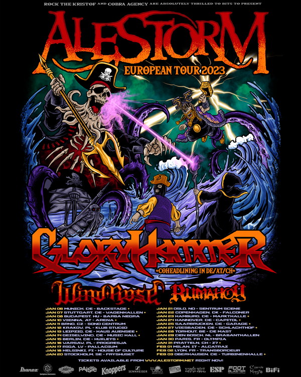 Oh wow! Following the release of their critically acclaimed seventh full-length album, Seventh Rum of a Seventh Rum, legendary pirate metal overlords Alestorm will set sail on a massive tour across the center of Europe, playing some of the biggest and best indoor venues on the continent in January and February of 2023. Joining them will be intergalactic power metal wizards Gloryhammer, who will perform a full co-headlining set at all German, Austrian and Swiss shows.