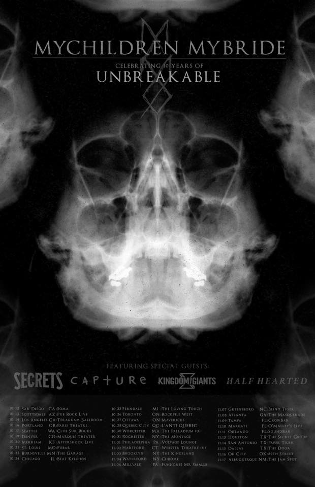 Metalcore band Mychildren Mybride (McMb) will be celebrating the 10th anniversary of their album “Unbreakable” by performing it in full on a fall North American tour. Secrets, Capture, Kingdom Of Giants, and Half Hearted will serve as support. Check out the poster and schedule below.