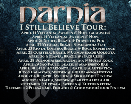 Narnia‘s South American tour kicks off April 21th. in Recife, Brazil. All dates and locations are listed below.
