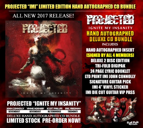 The follow-up to 2012’s “Human”“Ignite My Insanity” features twenty-one all-new tracks from Projected and continues to build upon the sound the band established with its debut. It is an album designed to resonate with fans from the members’ original projects and guaranteed to garner new fans along the way. From the melodic piano interlude of the opener ‘Strike’ to the raucous ending of closer ‘Battlestations’, the new album takes the listener on a journey inside the minds of the band. Songs like ‘Six Feet Below’, ‘Gomorrah’, ‘Inhuman’ and ‘Upside Down’ are infectious rockers. The first single, ‘Reload’, is a frenetic composition that showcases the musicianship of these accomplished performers. Alter Bridge/Tremonti songwriter Mark Tremonti co-wrote ‘Rectify’ and ‘Call Me The Devil’ and Sevendust‘s Morgan Rose co-wrote ‘Concede’ with Projected.