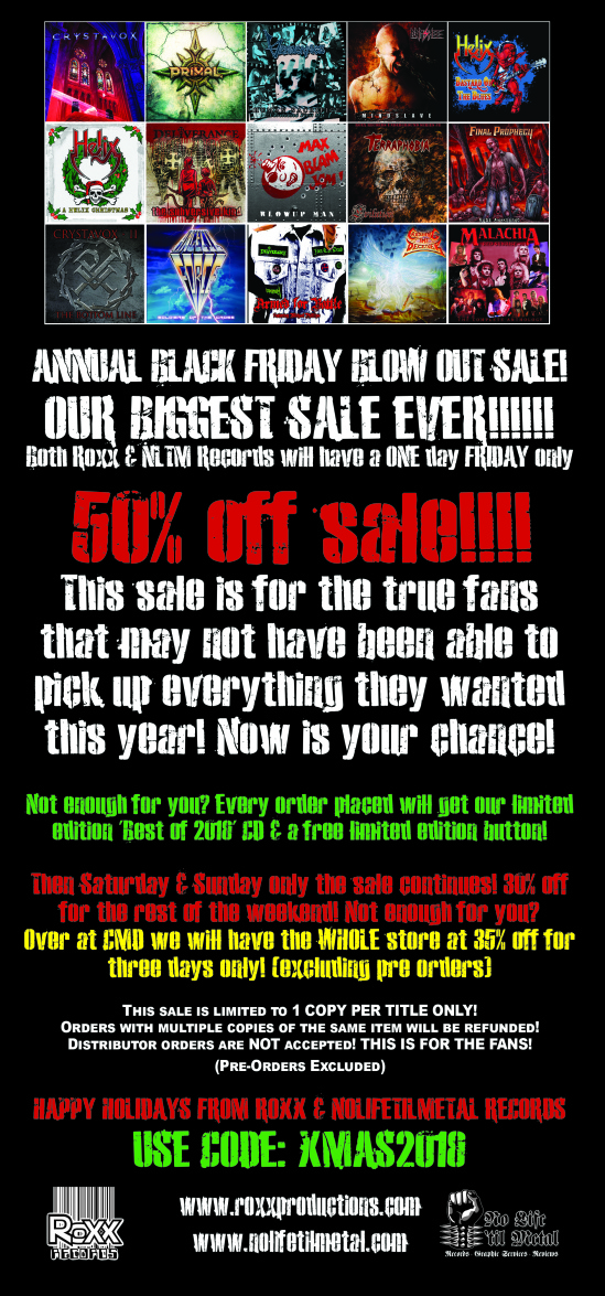 Roxx Records and No Life Til Metal Records 50% off EVERYTHING for the first 24 hours only! Starting Friday after Thanksgiving at midnight EST and ending Saturday at midnight EST firm! Then the sale continues at 35% off for the rest of the weekend!
