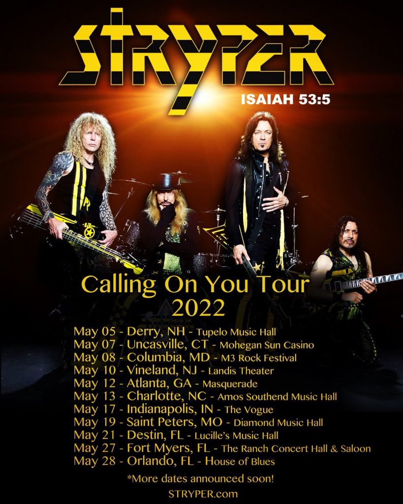 Stryper will embark on a U.S. tour in May 2022. The trek will include a stop at the M3 Rock Festival at the Merriweather Post Pavilion in Columbia, Maryland, where they will be joined by Skid Row and Tesla, among many others.